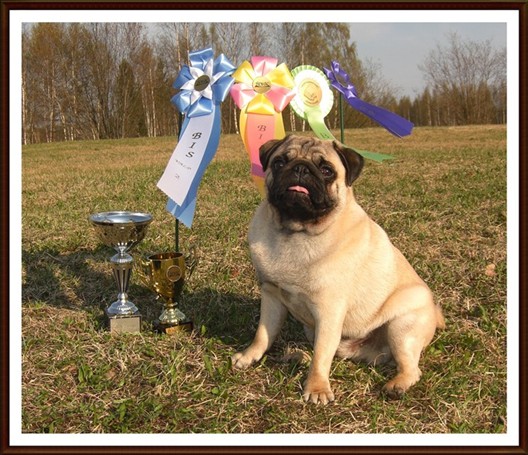 Kritik: Exc all over dog. Typ, head. Open nostrals. Large eyes wich are not exsessive. Exc button ears . Square body with a lot of substance. Double curled tail. Exc ang. Moves well. Typical movement.